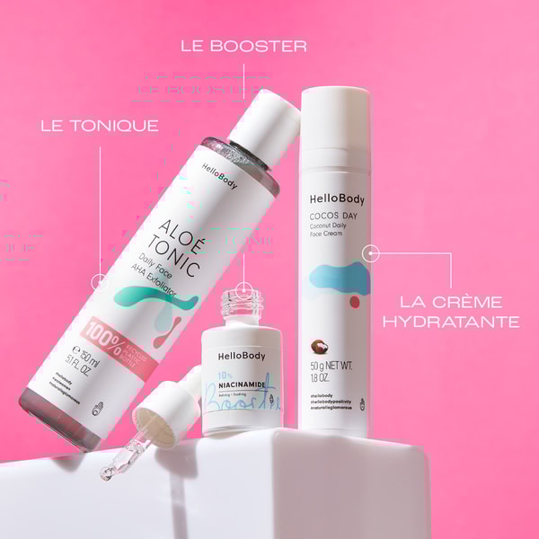 Bienvenue au cœur de l’univers Hellobody, là où soins riment avec quotidien. Préparez-vous à devenir accro à ces 5 soins format vente aux formules à 90% naturelles et vegan ! Alors, qu’attendez-vous pour découvrir cette routine visage minimaliste en 5 étapes pour une peau hydratée et régénérée ?