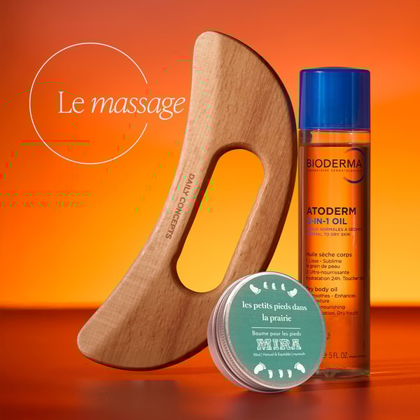 Lissez et sublimez votre peau avec l’huile sèche et l’action drainante du Gua Sha. Terminez en apportant du réconfort à vos pieds avec le baume onctueux.