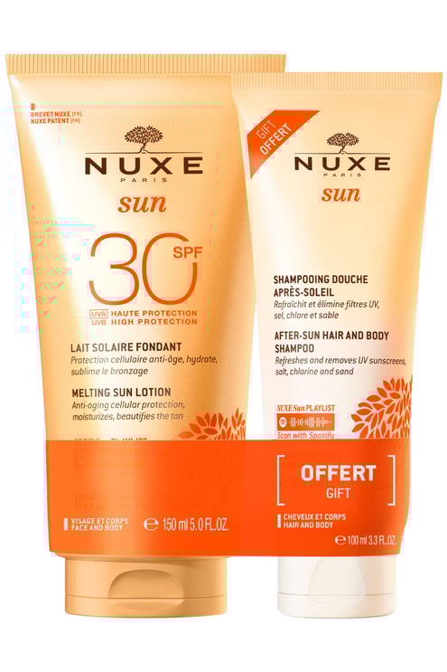 https://blissim.fr/wp-content/uploads/2024/01/design-sans-titre-2024-02-29t115443.811.jpg?width=495&height=743&fit=crop<p>Profitez pleinement de l&rsquo;été avec cette routine beauté Nuxe Sun !</p> <p>&nbsp;</p> <p>Lait Solaire Fondant Haute Protection SPF30 visage et corps (format vente 150ml) :<br /> Ce Lait Solaire SPF30 protège efficacement visage et corps des rayons du soleil : grâce a son complexe filtrant breveté*, il offre une protection large spectre UVA/UVB et prévient le photo-vieillissement cutané prématuré. Sa texture fondante hydrate et glisse sur votre peau sans laisser de traces pour sublimer le bronzage d&rsquo;un incroyable fini satiné. La peau est enveloppée d&rsquo;un parfum d&rsquo;évasion aux notes d&rsquo;Orange douce, de Fleur de Tiaré et de Vanille. Une irrésistible invitation à profiter de l&rsquo;été.</p> <p>&nbsp;</p> <p>Shampooing Douche après-soleil (format voyage 100ml) :<br /> Le Shampooing Douche Après-Soleil nettoie avec délicatesse. Il laisse votre peau douce et vos cheveux légers et brillants. Filtres UV, sel, chlore et sable s’évanouissent sous sa mousse onctueuse et délicieusement parfumée aux notes d&rsquo;Orange Douce, de Tiaré et de Vanille. Une sensation intense d‘évasion à chaque utilisation.</p> <p>Soins formulés et fabriqués en France.</p> <p>*Association de 3 filtres et de 2 esters.</p>Duo lait solaire fondant haute protection SPF30 & shampoing douche après-soleil 100ml offert