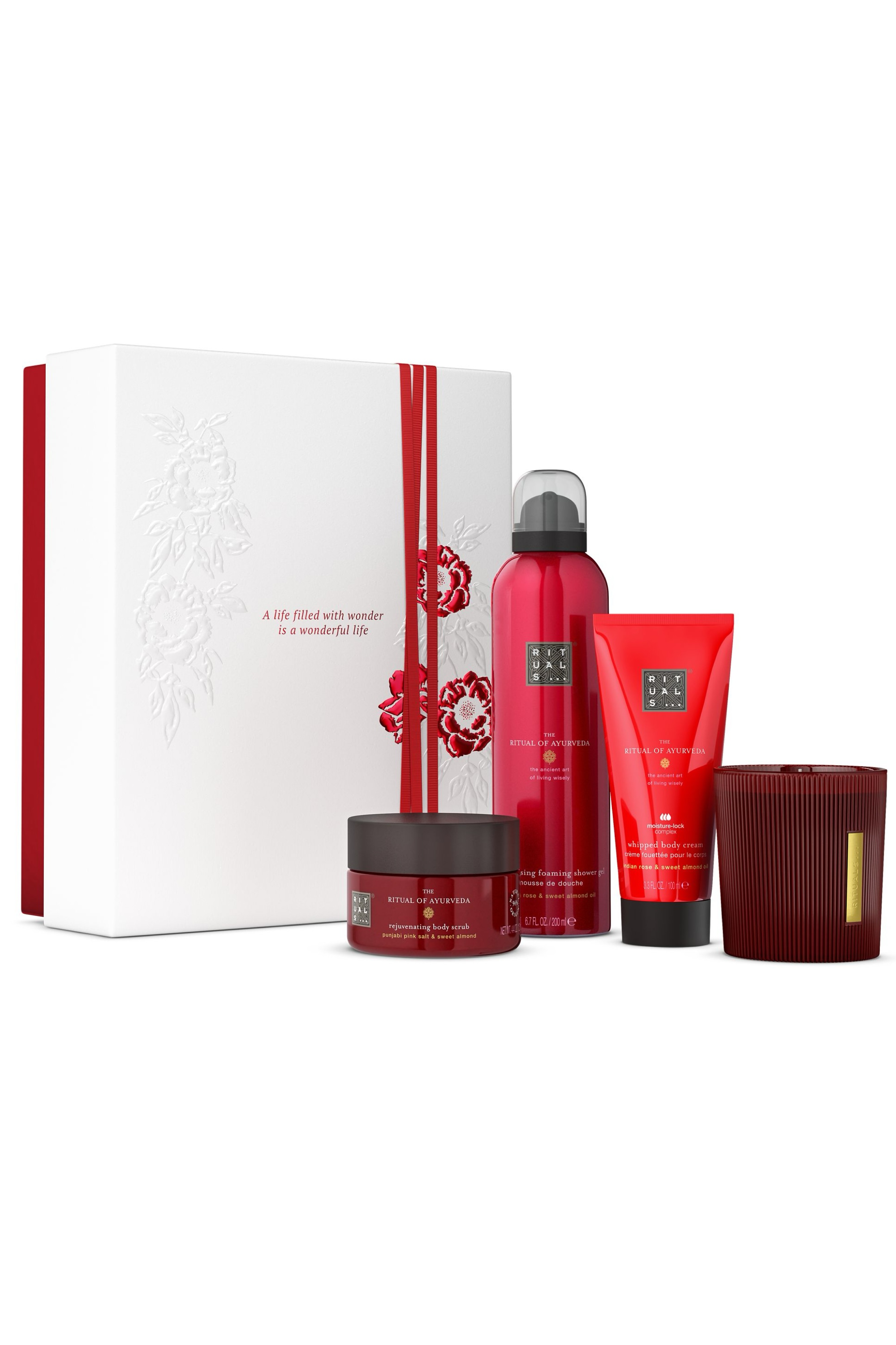 The Ritual of Ayurveda Foaming Shower Gel for Gift Set: Aqua/Water, Sodium Coco-Sulfate, Decyl Glucoside, Isopentane, Coco-Glucoside, Glycerin, PEG-120 Methyl Glucose Dioleate, Isopropyl Palmitate, Parfum/Fragrance, Isobutane, Rosa Damascena Flower Oil, Prunus Amygdalus Dulcis (Sweet Almond) Oil, Citric Acid, Sodium Benzoate, Guar Hydroxypropyltrimonium Chloride, Hexyl Cinnamal, Limonene, Linalool, Coumarin, Citronellol, Benzyl Benzoate.